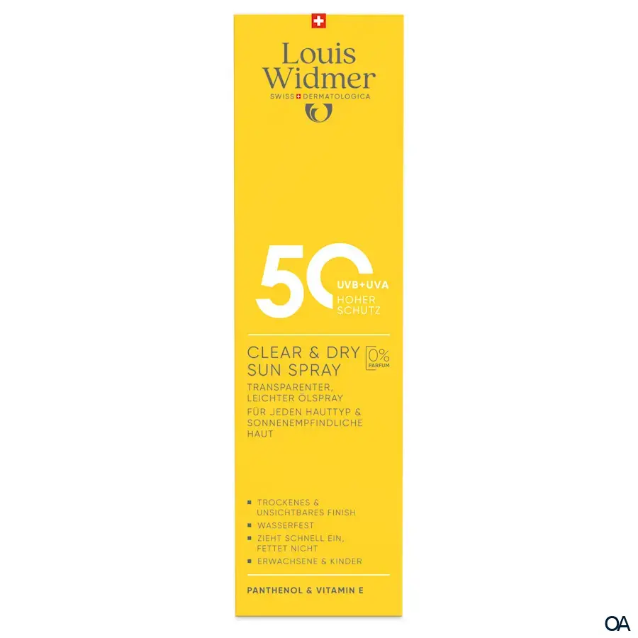 Louis Widmer Clear & Dry Sun Spray LSF 50: Transparenter, leichter & nicht fettender Sonnenschutz-Ölspray. Hoher Schutz für alle Hauttypen, auch empfindliche Haut. Wasserfest, schweißresistent & zieht schnell ein. Ideal für Sport, Freizeit & Alltag.Louis Widmer Clear & Dry Sun Spray LSF 50: Transparenter, leichter & nicht fettender Sonnenschutz-Ölspray. Hoher Schutz für alle Hauttypen, auch empfindliche Haut. Wasserfest, schweißresistent & zieht schnell ein. Ideal für Sport, Freizeit & Alltag.