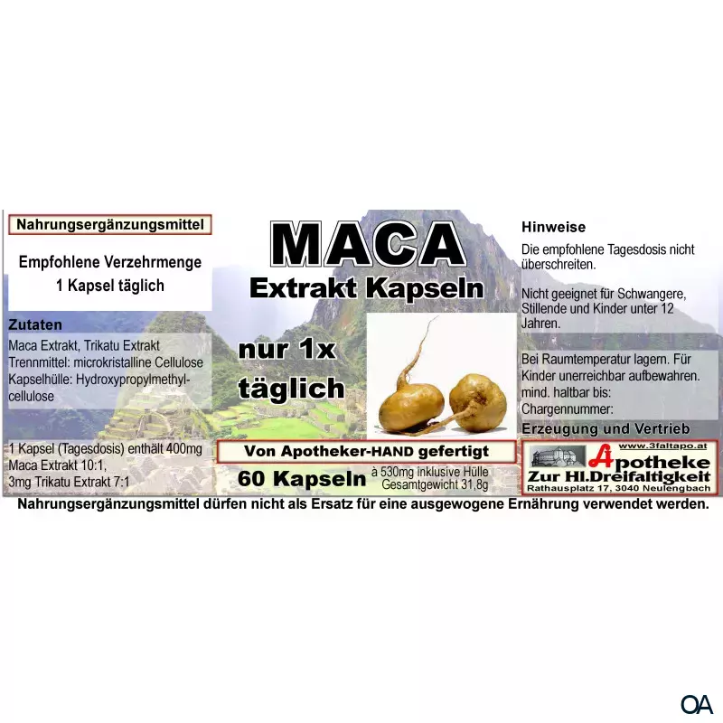 - Zusammensetzung pro Tagesdosis (1 Kapsel): 400mg Maca Extrakt 5:1, 3mg Trikatu Extrakt.