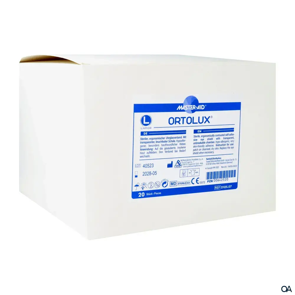 Master Aid® Ortolux® ist ein steriler, ergonomischer Uhrglasverband mit transparenter, bruchfester Schale und hypoallergenem, besonders hautfreundlichem Kleber.Master Aid® Ortolux® ist ein steriler, ergonomischer Uhrglasverband mit transparenter, bruchfester Schale und hypoallergenem, besonders hautfreundlichem Kleber. Insbesondere geeignet zur Schaffung einer feuchten Kammer bei Lagophthalmus und