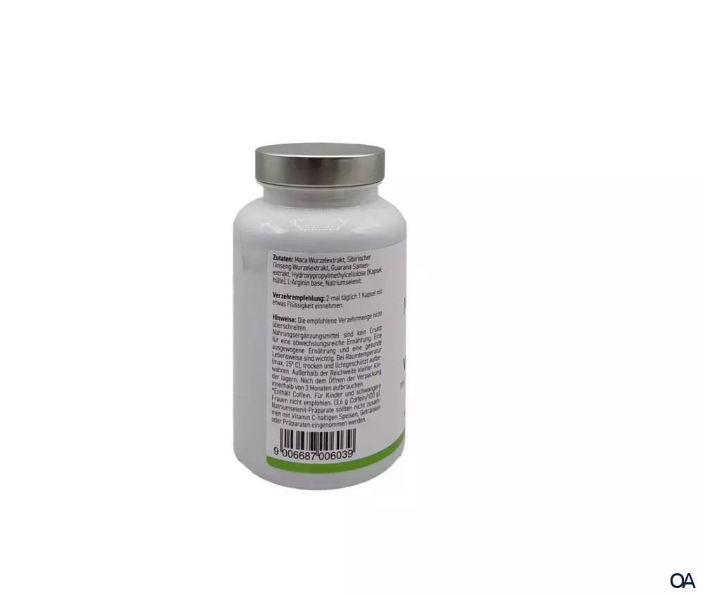 - Zutaten: Maca Wurzelextrakt, Sibirischer Ginseng Wurzelextrakt, Guarana Samenextrakt, Hydroxypropylmethylcellulose (Kapselhülle), L-Arginin base, Natriumselenit.