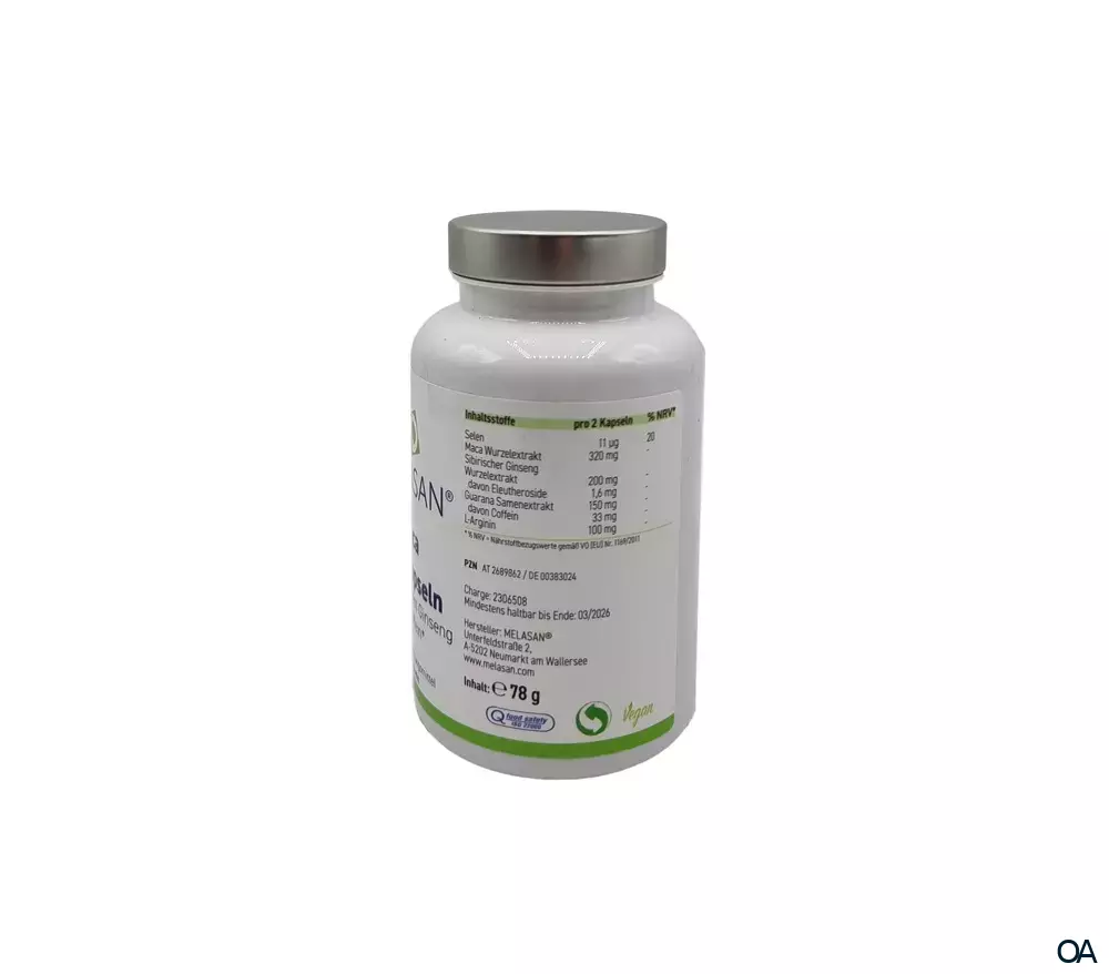 Die Melasan Maca Vitalkapseln enthalten eine Kombination der tonisierenden bioaktiven Inhaltsstoffe aus den hochwertigen pflanzlichen Extrakten von Maca, Sibirischem Ginseng, L-Arginin und Guarana (Coffein) fördert das allgemeine Wohlbefinden und die Leistungsfähigkeit.