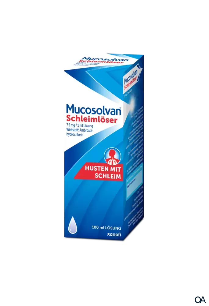 Mucosolvan® Schleimlöser 7,5 mg/1 ml Lösung ist ein Arzneimittel mit dem Wirkstoff Ambroxolhydrochlorid, zur Behandlung von akuten und chronischen Erkrankungen der Bronchien und der Lunge. Es löst zähen Schleim und erleichtert das Abhusten.Mucosolvan® Schleimlöser 7,5 mg/1 ml Lösung ist ein schleimlösendes Arzneimittel mit dem Wirkstoff Ambroxolhydrochlorid, zur Behandlung von akuten und chronischen Erkrankungen der Bronchien und der Lunge. Es löst zähen Schleim und erleichtert das Abhusten.