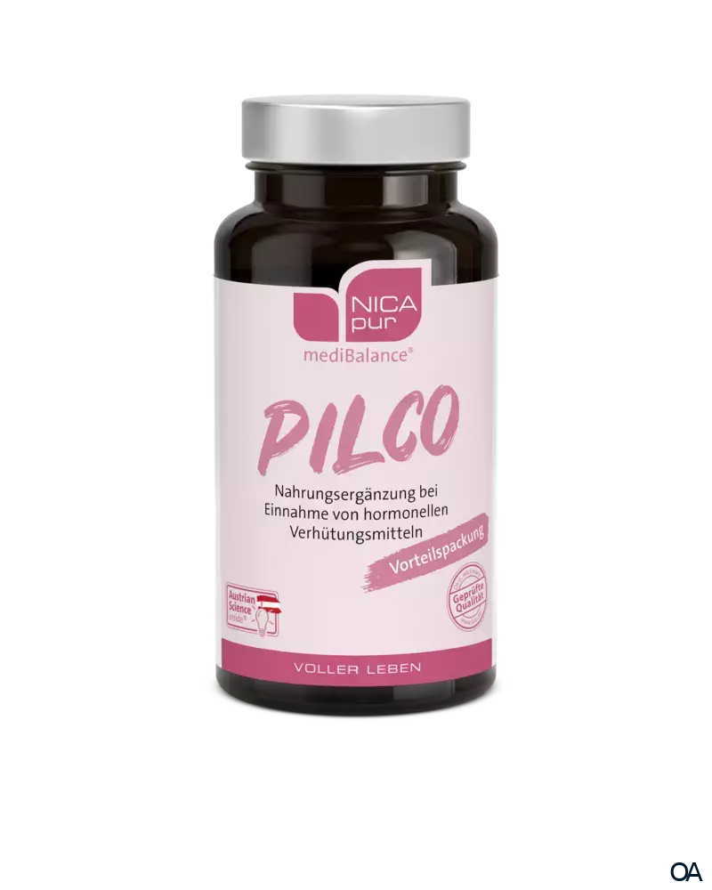 NICApur mediBalance® PILCO Kapseln sind ein Nahrungsergänzungsmittel mit ausgewählten Vitaminen und Mineralstoffen bei Einnahme von hormonellen Verhütungsmitteln (Pille, Verhütungsring, Pflaster, Hormonspirale, Implanon oder 3-Monatsspritze).
