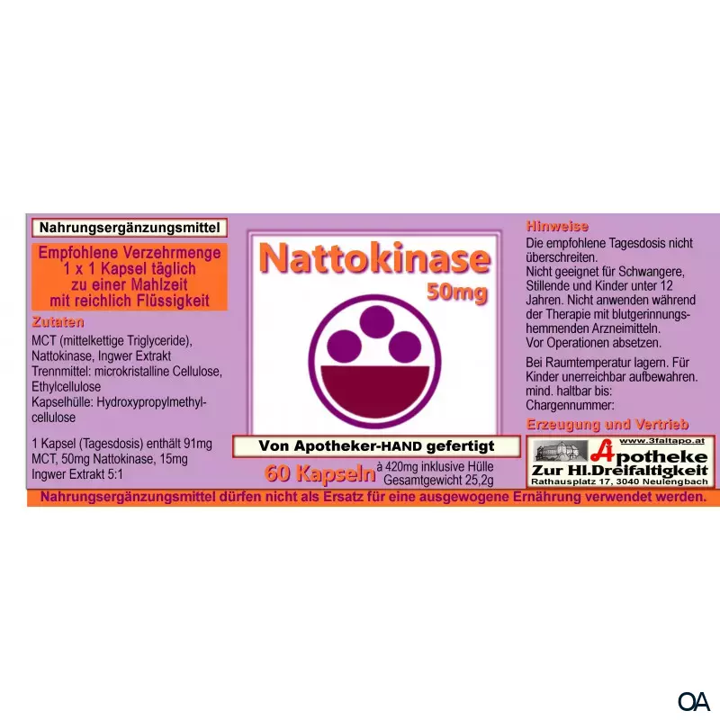 - Zusammensetzung pro Tagesdosis (1 Kapsel): 150mg Fischöl mikroverkapselt, 50mg Nattokinase, 15mg Ingwer Extrakt 5:1.