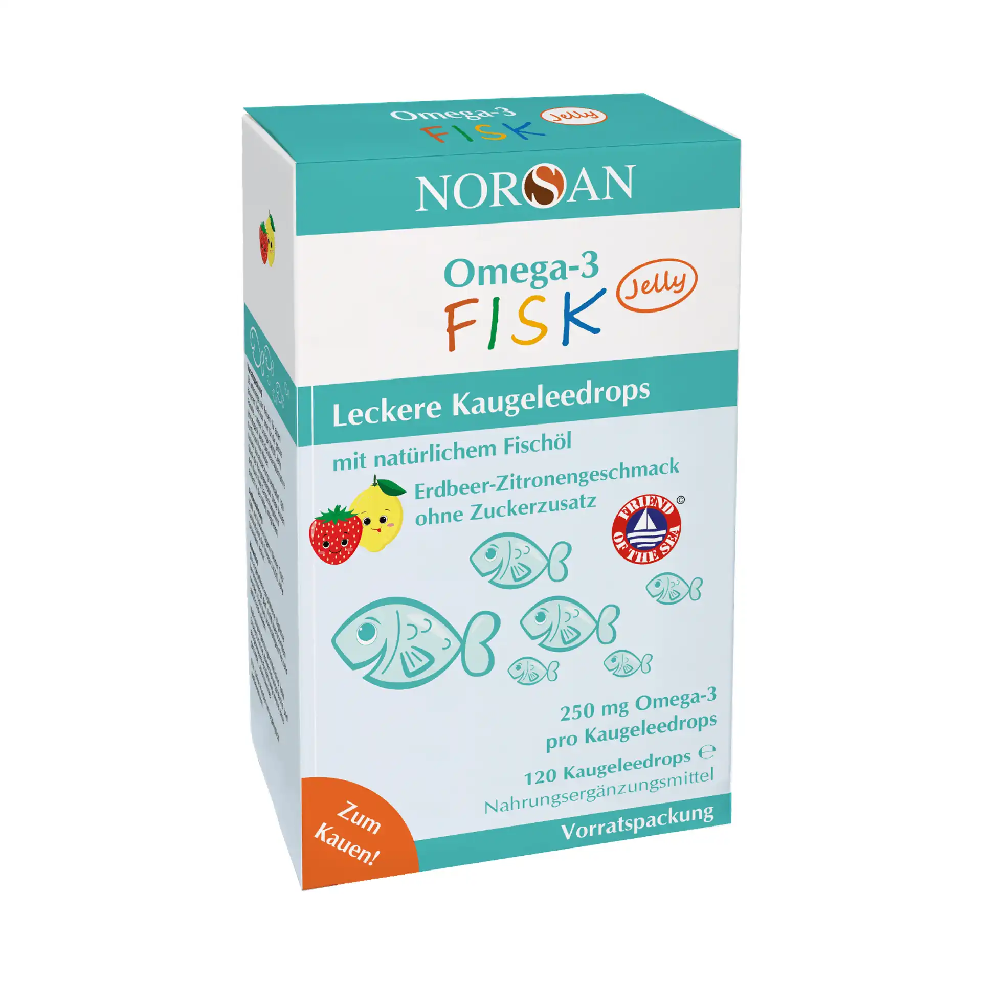 NORSAN Omega-3 FISK Jelly sind leckere Kaugeleedrops mit fruchtigem Erdbeer-Zitronengeschmack. Die perfekte Fischöl-Alternative für Kinder! Das Besondere: Die Drops sind zum Kauen und speziell für die Bedürfnisse von Kindern entwickelt worden.