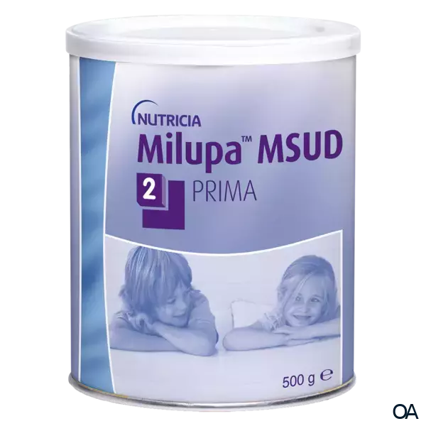 Nutricia Milupa MSUD 2 PRIMA Pulver ist ein Lebensmittel für besondere medizinische Zwecke (bilanzierte Diät). Zum Diätmanagement bei Kleinkindern ab 1 Jahr und Schulkindern mit Störungen im Stoffwechsel verzweigtkettiger Aminosäuren (z.B. Ahornsirupkrankheit).