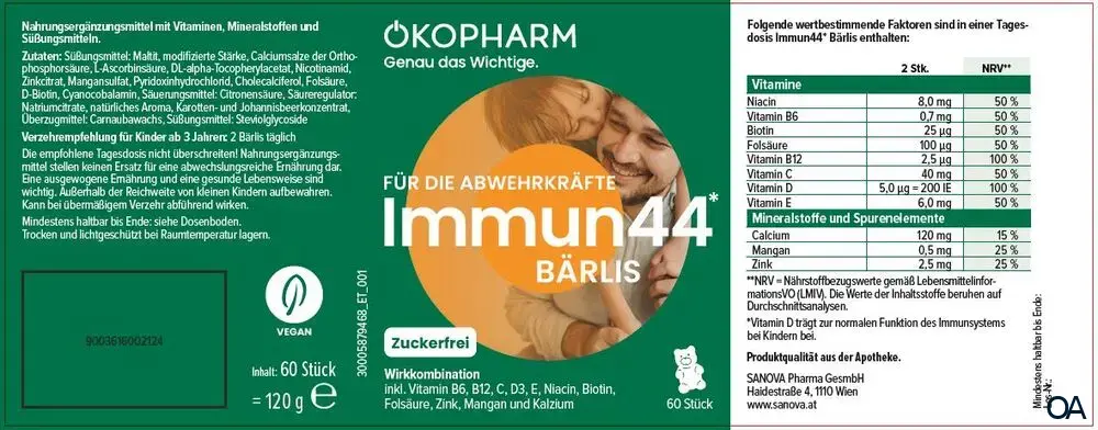 - Mit Vitaminen, Mineralstoffen und Süßungsmitteln helfen Immun44* Bärlis, die täglichen Nährstoffbedürfnisse zu decken. Zusätzlich wird das Immunsystem unterstützt. *