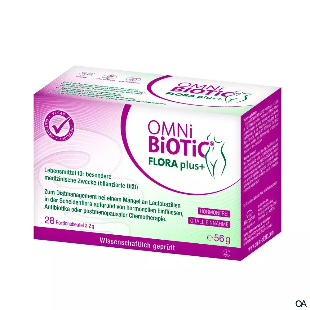 OMNi-BiOTiC® FLORA plus+ ist ein Nahrungsergänzungsmittel für besondere medizinische Zwecke. Zum Diätmanagement bei einem Mangel an Lactobazillen in der Scheidenflora aufgrund hormonellen Einflüssen, Antibiotika oder postmenopausaler Chemotherapie.OMNi-BiOTiC® FLORA plus+ ist ein Nahrungsergänzungsmittel für besondere medizinische Zwecke (bilanzierte Diät).