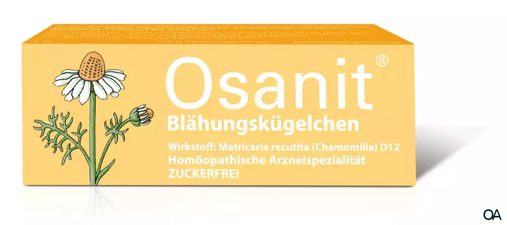 - In Osanit® Blähungskügelchen ist der Wirkstoff Matricaria recutita (Chamomilla) D12 enthalten, aus der frischen, ganzen Pflanze Echte Kamille gewonnen.