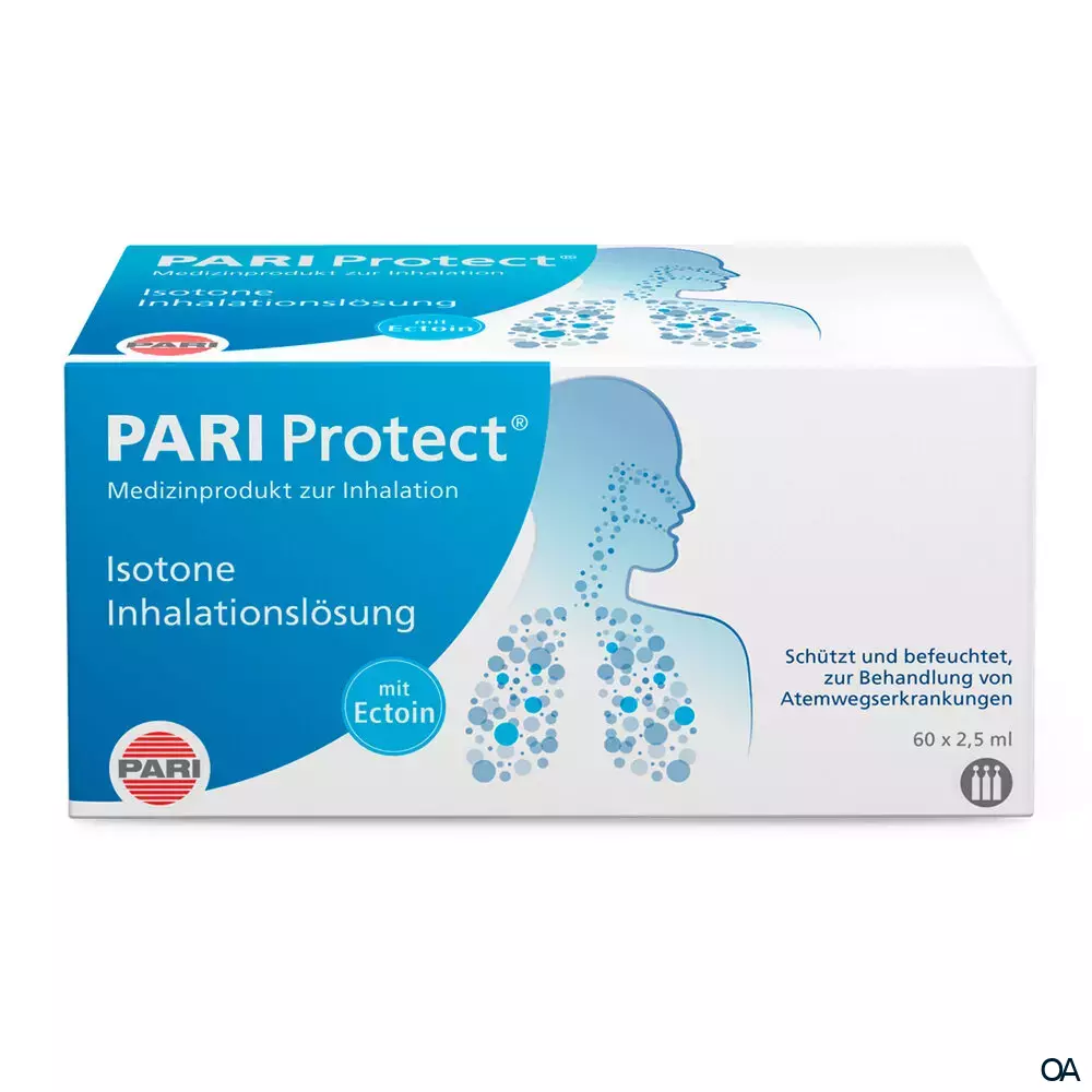 - PARI ProtECT® Inhalationslösung schützt vor Austrocknung und befeuchtet die Schleimhäute der Atemwege wenn sie z. B. Feinstaub, Pollen, Schmutz oder trockener Luft in geheizten oder klimatisierten Räumen ausgesetzt sind.