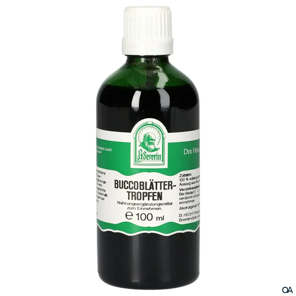 Zusammensetzung: Buccoblättertropfen enthalten einen wässrig/alkoholischen Auszug aus Buccoblättern. Der Auszug wird nach Vorgaben des Arzneibuches hergestellt. Alkoholgehalt: 66% Vol.