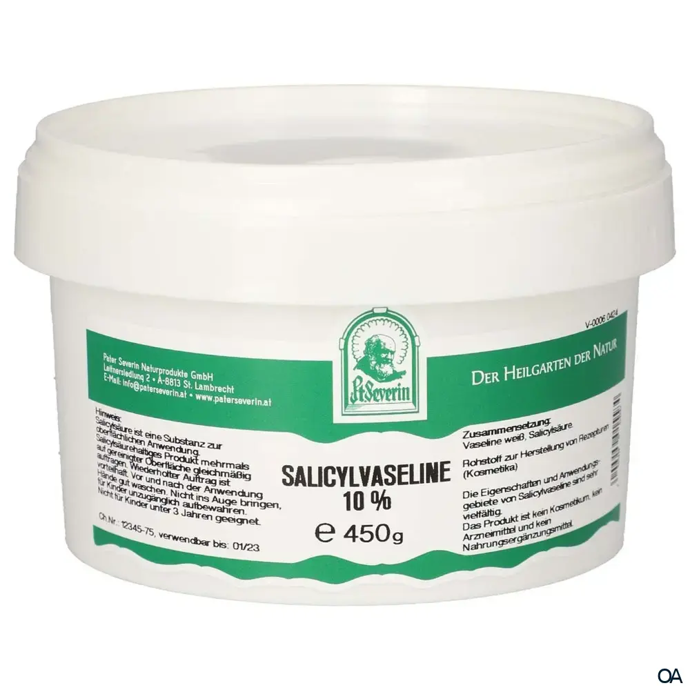 Die Pater Severin Salicylvaseline 10% Salbe dient zur Anwendung auf der intakten Haut. Die Eigenschaften und Anwendungsgebiete von Salicylvaseline sind sehr vielfältig.Die Pater Severin Salicylvaseline 10% Salbe dient zur Anwendung auf der intakten Haut. Die Eigenschaften und Anwendungsgebiete von Salicylvaseline sind sehr vielfältig.