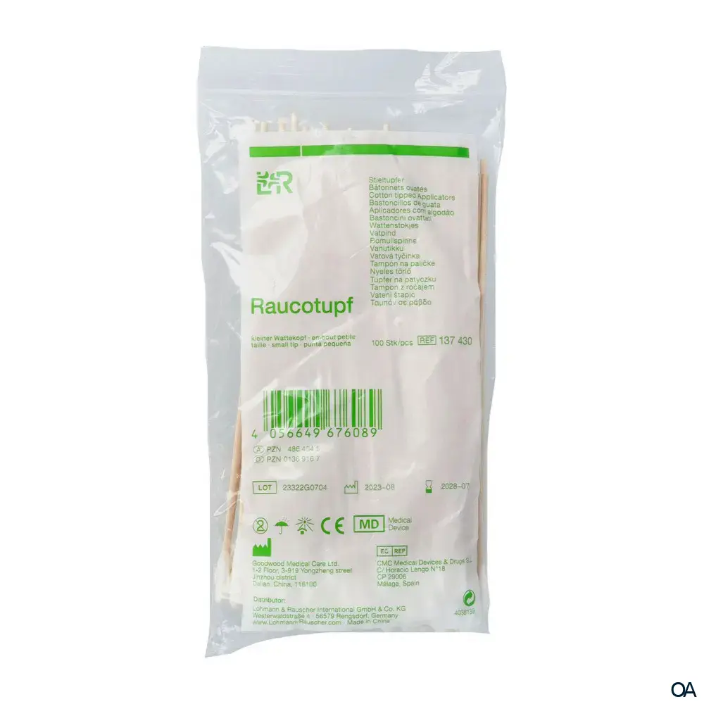 Die Raucotupf Stieltupfer mit kleinem Wattekopf und einem Stiel aus Holz dient als Hilfsmittel bei der Wundversorgung, Kosmetik und medizinische Anwendungen.