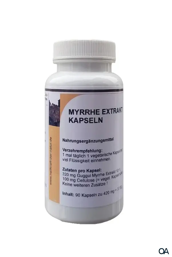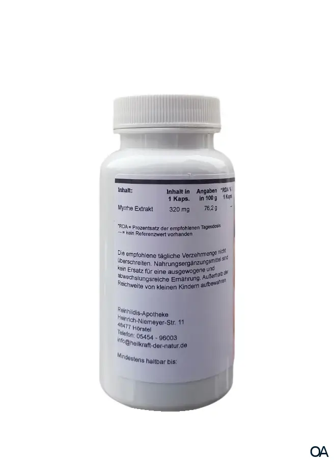 Die Reinhildis Apotheke Myrrhe Extrakt Kapseln sind ein Nahrungsergänzungsmittel mit 320 mg Guggul Myrrhe 10:1 Extrakt (indische Myrrhe) pro Kapsel.