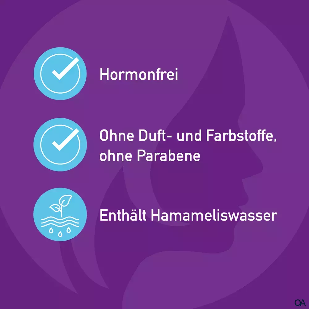 - Durch den hohen Wassergehalt der Creme wird der Haut im Bereich der Scheide und des äußeren Intimbereichs Feuchtigkeit zugeführt.