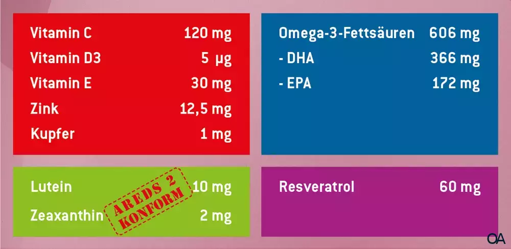 - Zusammensetzung pro Tagesdosis (2 Kapseln) %NRV*: Vitamin C* 120 mg 150%, Vitamin E* 30 mg α-TE 250%, Vitamin D3 5 µg 100%, Zink* 12,5 mg 125%, Kupfer* 1000 µg 100%, Fischöl 950 mg davon Omega 3-Fettsäuren 606 mg- DHA *** 366 mg- EPA 172 mg, Lutein 10 mg ,Zeaxanthin 2 mg, trans-Resveratrol**** 60 mg. * Zink, Kupfer, Vitamin E und Vitamin C tragen dazu bei, die Zellen vor oxidativem Stress zu schützen. ** Nährstoffbezugswerte (nutrient reference values) gemäß VO (EU) Nr. 1169/2011. *** DHA trägt zur Erhaltung der normalen Sehkraft bei. Die positive Wirkung erreicht man mit einer täglichen Aufnahme von 250 mg DHA. **** Die tägliche Verzehrmenge von 150 mg Resveratrol sollte nicht überschritten werden.