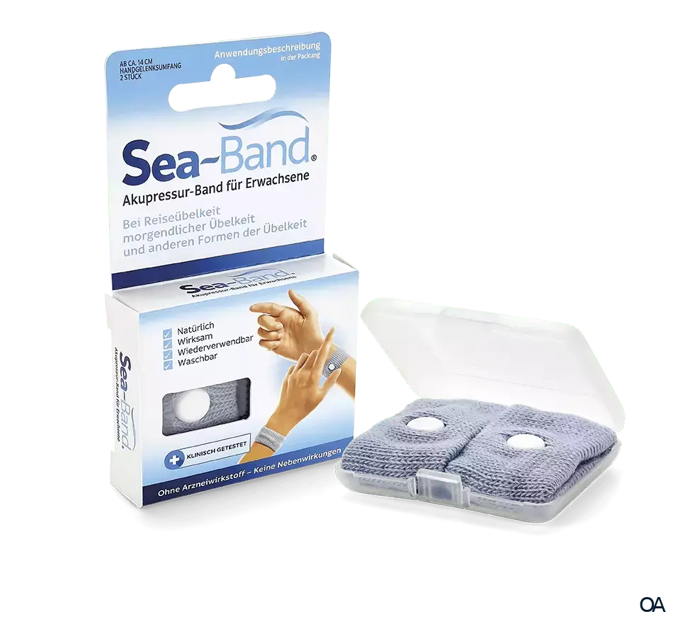Die SEA-BAND Akupressurbänder werden unterhalb beider Handgelenke getragen. Der an der Innenseite angebrachte Kunststoffknopf übt einen leichten, sorgfältig kontrollierten Druck auf den Nei-Kuan Akupressurpunkt aus und verhindert oder beseitigt so die verschiedenen Arten der Übelkeit. Da diesem Akupressurpunkt eine hohe Wirksamkeit zugeordnet wird, tritt die Wirkung meistens bereits innerhalb von 2 bis 5 Minuten ein und bleibt erhalten, solange die Bänder getragen werden. Das Akupressurband von SEA-BAND wurde von Ärzten und Krankenhäusern in mehr als 25 klinischen Studien getestet und in über 50 Ländern millionenfach eingesetzt. Das Band kann ohne Bedenken von Schwangeren und Kindern getragen werden, da es sich um kein Arzneimittel handelt und keine Nebenwirkungen hervorruft.