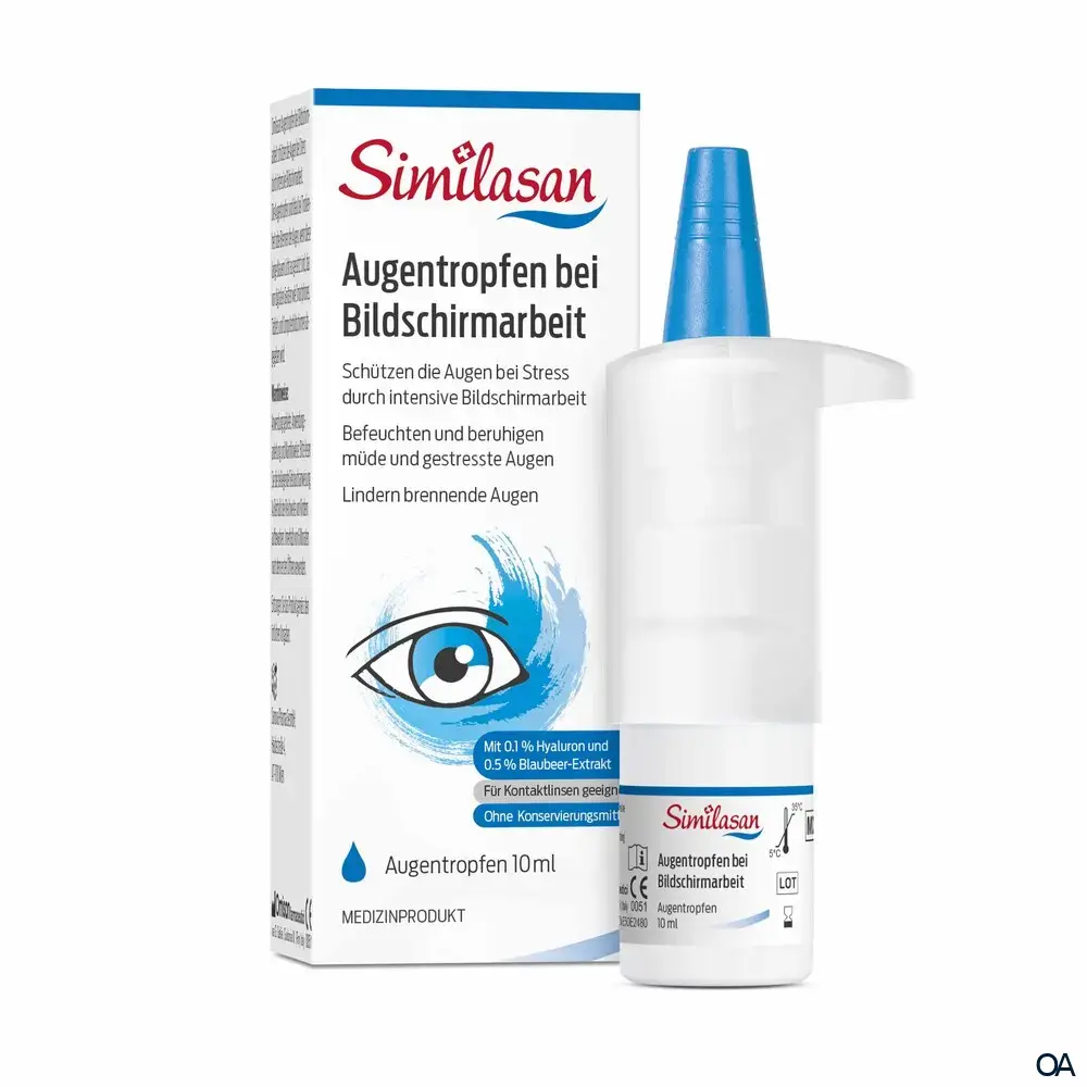 Similasan Augentropfen bei Bildschirmarbeit schützen die Augen bei Stress durch intensive Bildschirmarbeit. Befeuchten und beruhigen gestresste Augen und lindern brennende Augen mit Flüssigextrakt aus Blaubeeren 0.5 %.