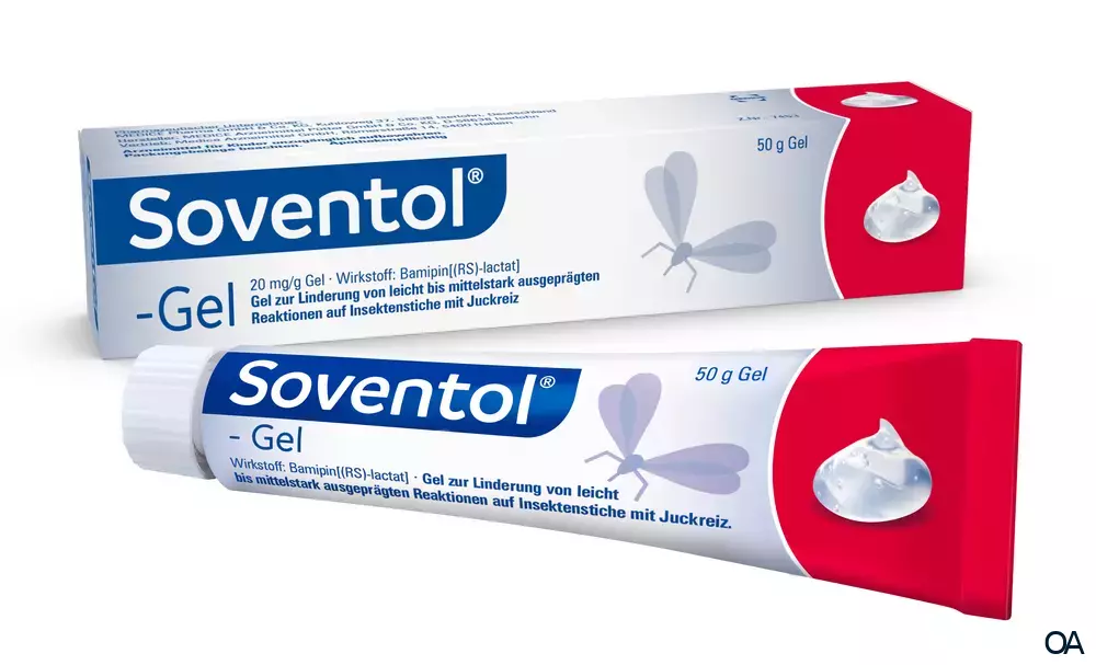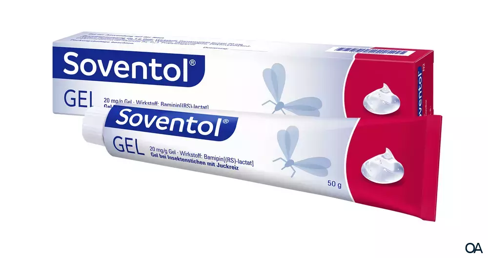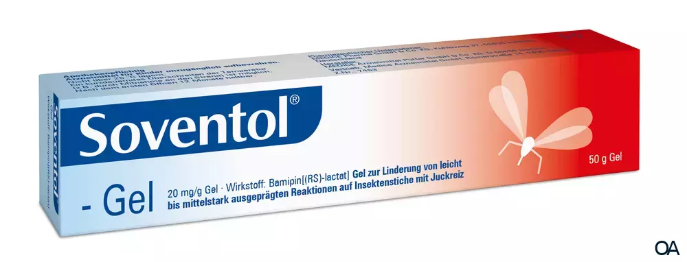 - Bei Insektenstichen ist Soventol® Gel ein echter Klassiker für die ganze Familie! Es nimmt die Rötung und lindert den Juckreiz – schnell und langanhaltend zugleich. Denn nur Soventol® Gel enthält das Antihistaminikum Bamipin, das für seinen schnellen Wirkeintritt und den langen Wirkeffekt bekannt ist. Dies wurde in unterschiedlichen Studien bereits mehrfach gezeigt.