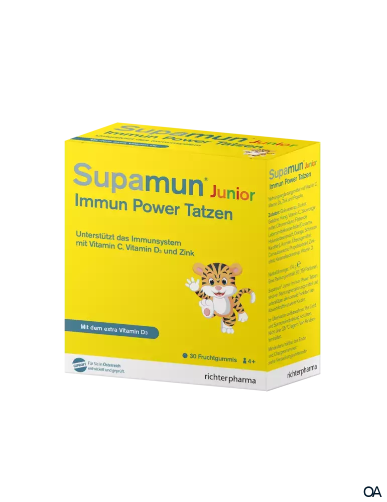 Supamun® Immun Junior Power Tatzen sind ein Nahrungsergänzungsmittel mit Vitamin C, Vitamin D3, Zink und Propolis und unterstützen die normale Funktion des Immunsystems unserer Kinder .