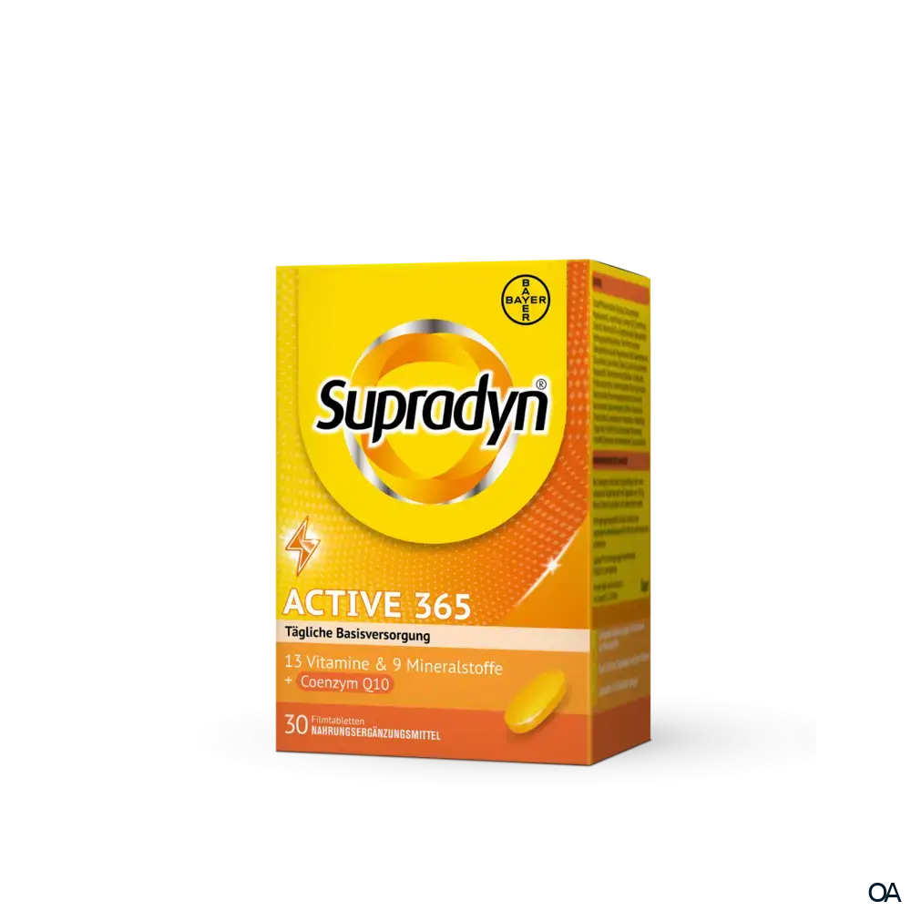 Supradyn® active 365 Filmtabletten sind ein Nahrungsergänzungsmittel mit allen 13 Vitaminen, 9 Mineralstoffen sowie Coenzym Q10. Die spezielle Dosierung versorgt den Körper mit wichtigen Vitaminen und Mineralstoffen des täglichen Bedarfs.Supradyn® active 365 Filmtabletten sind ein Nahrungsergänzungsmittel mit allen 13 Vitaminen, 9 Mineralstoffen sowie Coenzym Q10. Die spezielle Dosierung versorgt den Körper mit wichtigen Vitaminen und Mineralstoffen des täglichen Bedarfs.