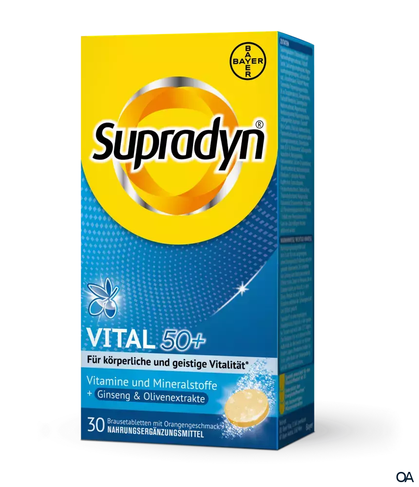 Die Supradyn® vital 50+ Brausetabletten mit Ginseng- & Olivenextrakten sind ein Nahrungsergänzungsmittel mit einer Mikronährstoffkombination, die speziell für den spezifischen Bedarf von Personen über 50 Jahren entwickelt wurde.Eigenschaften