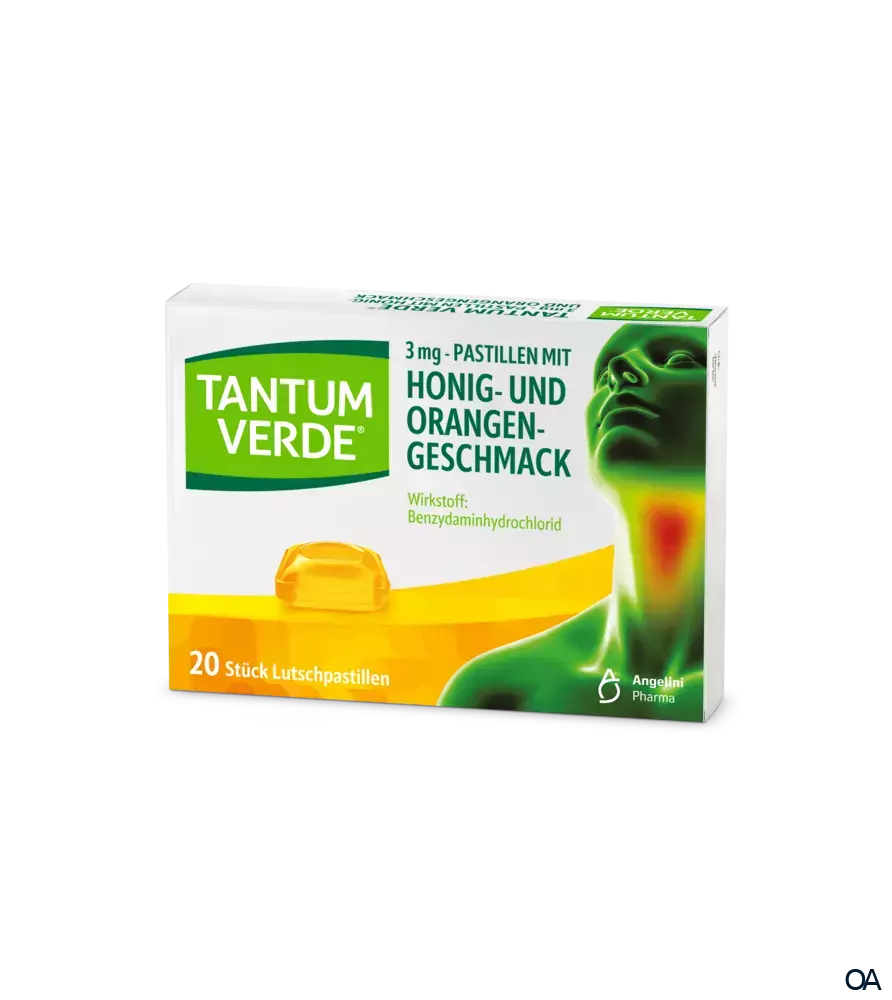 Tantum Verde® Pastillen Honig- und Orangengeschmack mit dem Wirkstoff Benzydaminhydrochlorid besitzt entzündungshemmende und schmerzstillende Eigenschaften. Dient zur symptomatische Behandlung von schmerzhaften Entzündungen des Mund- und Rachenraumes.Tantum Verde® Pastillen Honig- und Orangengeschmack mit dem Wirkstoff Benzydaminhydrochlorid besitzt entzündungshemmende und schmerzstillende Eigenschaften. Dient zur symptomatische Behandlung von schmerzhaften Entzündungen des Mund- und Rachenraumes.
