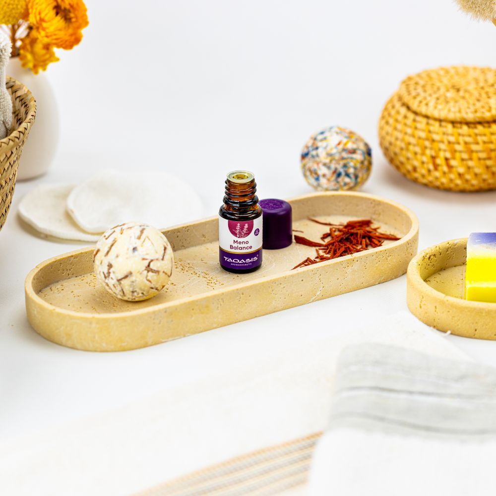 Die Meno Balance Duftkomposition wirkt aufbauend, stärkend und inspirierend. Die Kombination aus Muskatellersalbei, Rosengeranie und Bergamotte fördert ein Gefühl von Ruhe und Ausgleich, das besonders in der Menopause als wohltuend empfunden wird.