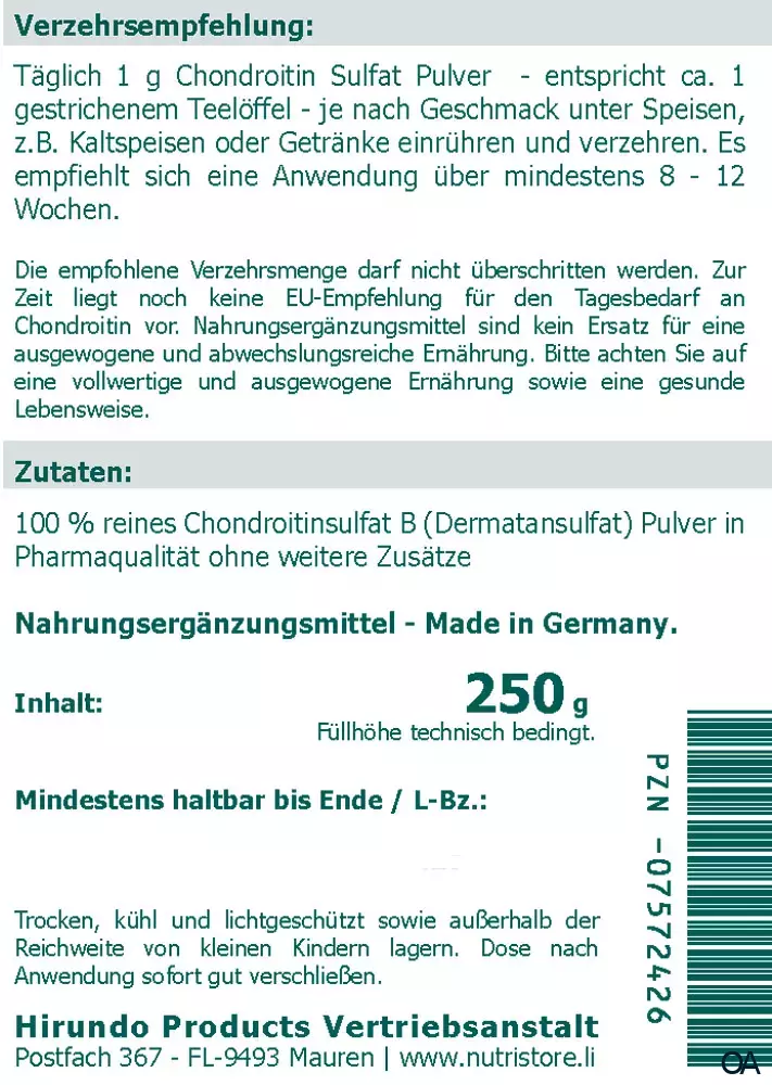 - Hinweise: Die empfohlene Verzehrsmenge darf nicht überschritten werden. Zur Zeit liegt noch keine EU-Empfehlung für den Tagesbedarf an Chondroitin vor.