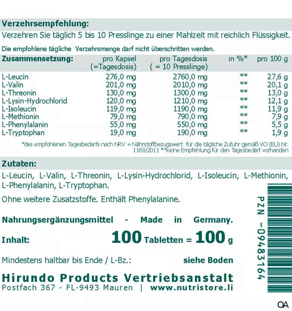 - Zusammensetzung pro Tagesdosis ( = 10 Tablette) in %*: L-Leucin 2760,0 mg **, L-Valin 2010,0 mg **, L-Threonin 1300,0 mg **, L-Lysin-Hydrochlorid 1200,0 mg **, L-Isoleucin 1190,0 mg **, L-Methionin 790,0 mg **, L-Phenylalanin 550,0 mg **, L-Tryptophan 190,0 mg **. *des empfohlenen Tagesbedarfs nach NRV = Nährstoffbezugswert für die tägliche Zufuhr gemäß VO (EU) Nr. 1169/2011. **keine Empfehlung für den Tagesbedarf vorhanden.