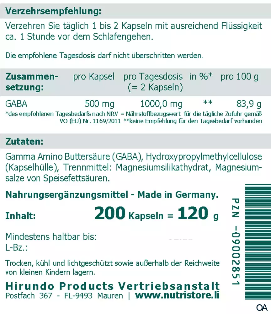 - Zusammensetzung pro Tagesdosis ( = 2 Kapseln) in %*: GABA 1000 mg **. *des empfohlenen Tagesbedarf nach NRV = Nährstoffbezugswert für die tägliche Zufuhr gemäß VO (EU) Nr. 1169/2011. **keine Empfehlung für den Tagesbedarf vorhanden.