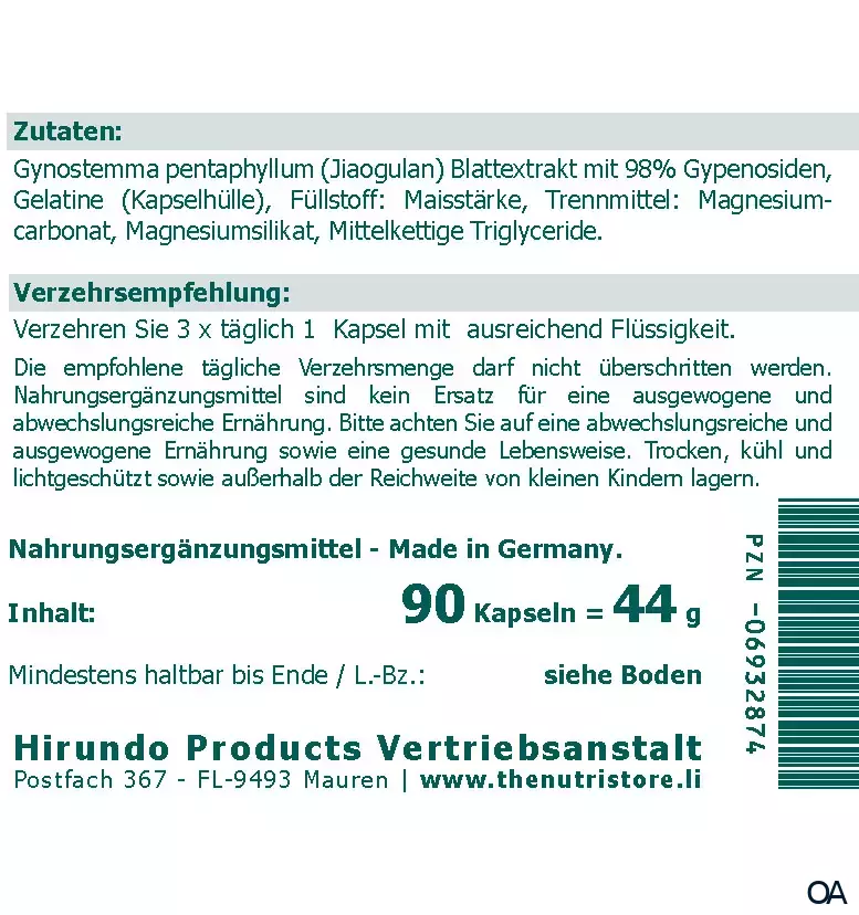 - Zutaten: Gynostemma pentaphyllum (Jiaogulan) Blattextrakt mit 98% Gypenosiden, Gelatine (Kapselhülle), Füllstoff: Maisstärke, Trennmittel: Magnesiumcarbonat, Magnesiumsilikat, Mittelkettige Triglyceride.