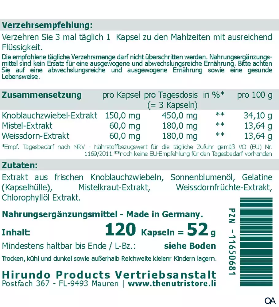 - Zusammensetzung pro Tagesdosis (3 Kapseln): Knoblauchzwiebel-Extrakt 450,0 mg **, Mistel-Extrakt 180,0 mg **, Weissdorn-Extrakt 180,0 mg. *Empf. Tagesbedarf nach NRV = Nährstoffbezugswert für die tägliche Zufuhr gemäß VO (EU) Nr. 1169/2011. **noch keine EU-Empfehlung für den Tagesbedarf vorhanden.