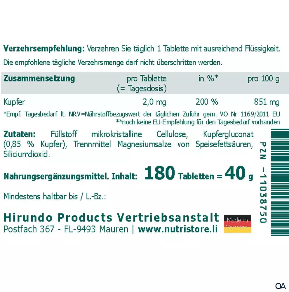 - Zusammensetzung pro Tagesdosis (2 Tabletten) %NRV*: Kupfer 2,0 mg 200 %. * des empfohlenen Tagesbedarfs lt. NRV = Nährstoffbezugswert für die täglichen Zufuhr gemäß VO (EU) Nr. 1169/2011. **keine Empfehlung für den Tagesbedarf vorhanden.
