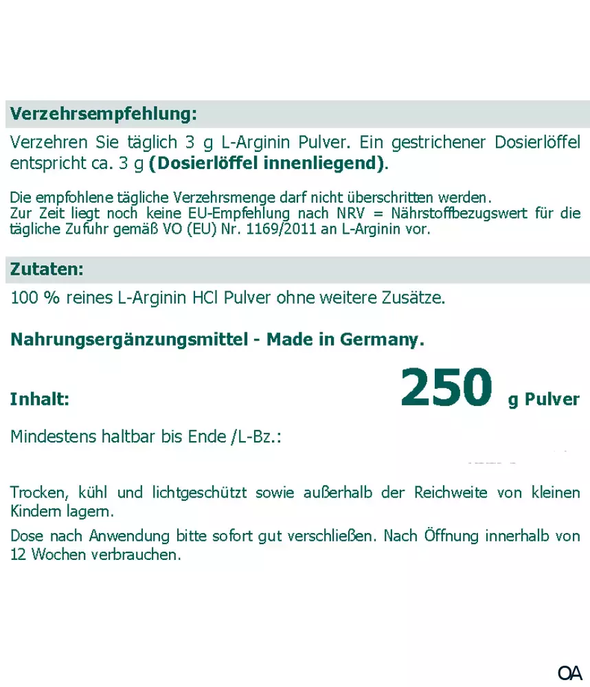 Zutaten: 100 % reines L-Arginin HCl Pulver ohne weitere Zusätze.