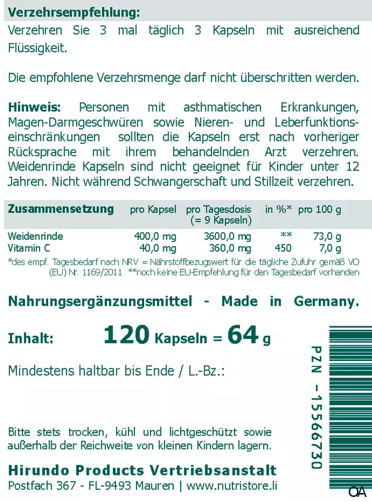 - Zusammensetzung pro Tagesdosis (9 Kapseln) %NRV*: Weidenrinde 3600,0 mg **, Vitamin C 360,0 mg 450 %. *des empf. Tagesbedarf nach NRV = Nährstoffbezugswert für die tägliche Zufuhr gemäß VO (EU) Nr. 1169/2011. **noch keine EU-Empfehlung für den Tagesbedarf vorhanden.