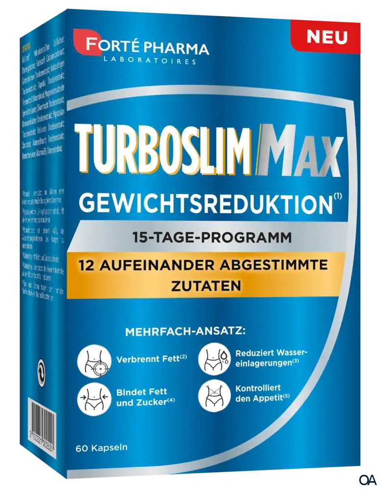 Die TurboSlim MAX Kapseln sind ein Nahrungsergänzungsmittel mit Vitaminen, Chrom, Zink und Pflanzenextrakten. Die 12 enthaltenen Zutaten sind aufeinander ideal abgestimmt.