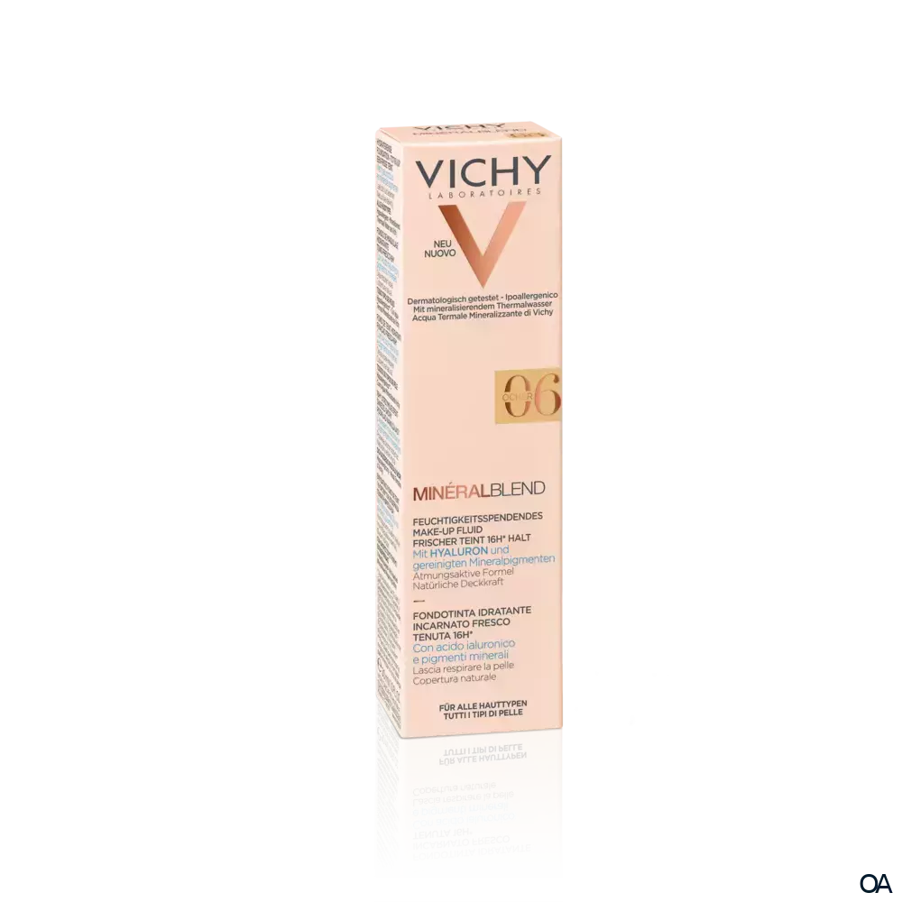 VICHY Mineralblend Fluid 06 - Ocher - Ein ultra-leichtes Make-up-Fluid mit Hyaluron. Feuchtigkeitsspendend wie eine Pflege. Die atmungsaktive Minéralblend-Formel enthält Aktiv-Wirkstoffe wie natürliches Hyaluron, gereinigte Mineralpigmente und ...Ein ultra-leichtes Make-up-Fluid mit Hyaluron. Feuchtigkeitsspendend wie eine Pflege. Die atmungsaktive Minéralblend-Formel enthält Aktiv-Wirkstoffe wie natürliches Hyaluron, gereinigte Mineralpigmente und Vulkanischem Wasser von Vichy, die die Haut sofort mit Feuchtigkeit versorgen und pflegen.