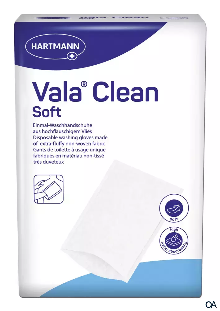 Vala®Clean soft Einmal-Waschhandschuhe sind weich und saugfähig, auch in nassem Zustand formstabil und abriebfest. Geeignet zur Anwendung am Patienten.