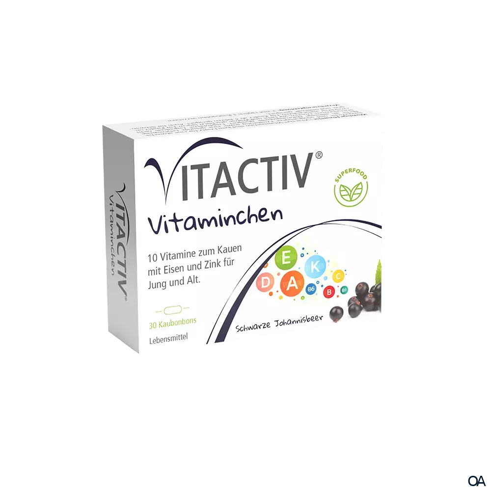 Vitactiv® Vitaminchen sind zuckerhaltige Kaubonbons mit Geschmack nach schwarzer Johannisbeere für Jung und Alt, angereichert mit 10 Vitaminen (A, B1, B2, B3 (Niacin), B6, B12, C, D, E & Folsäure), Eisen und Zink.