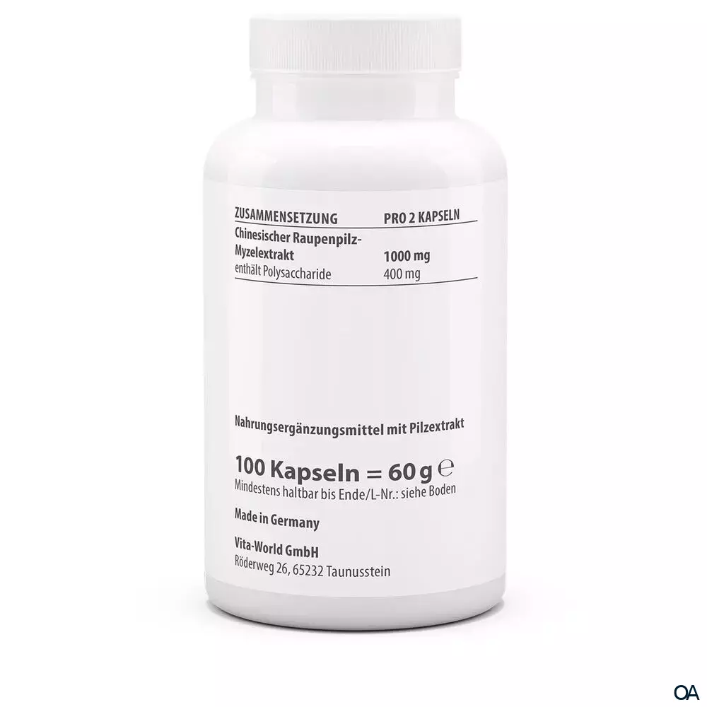 - Zutaten: 83,3 % Chinesischer Raupenpilz-Myzelextrakt (Cordyceps sinensis, enthält 40 % Polysaccharide), Überzugsmittel: Hydroxypropylmethylcellulose (pflanzliche Kapselhülle).