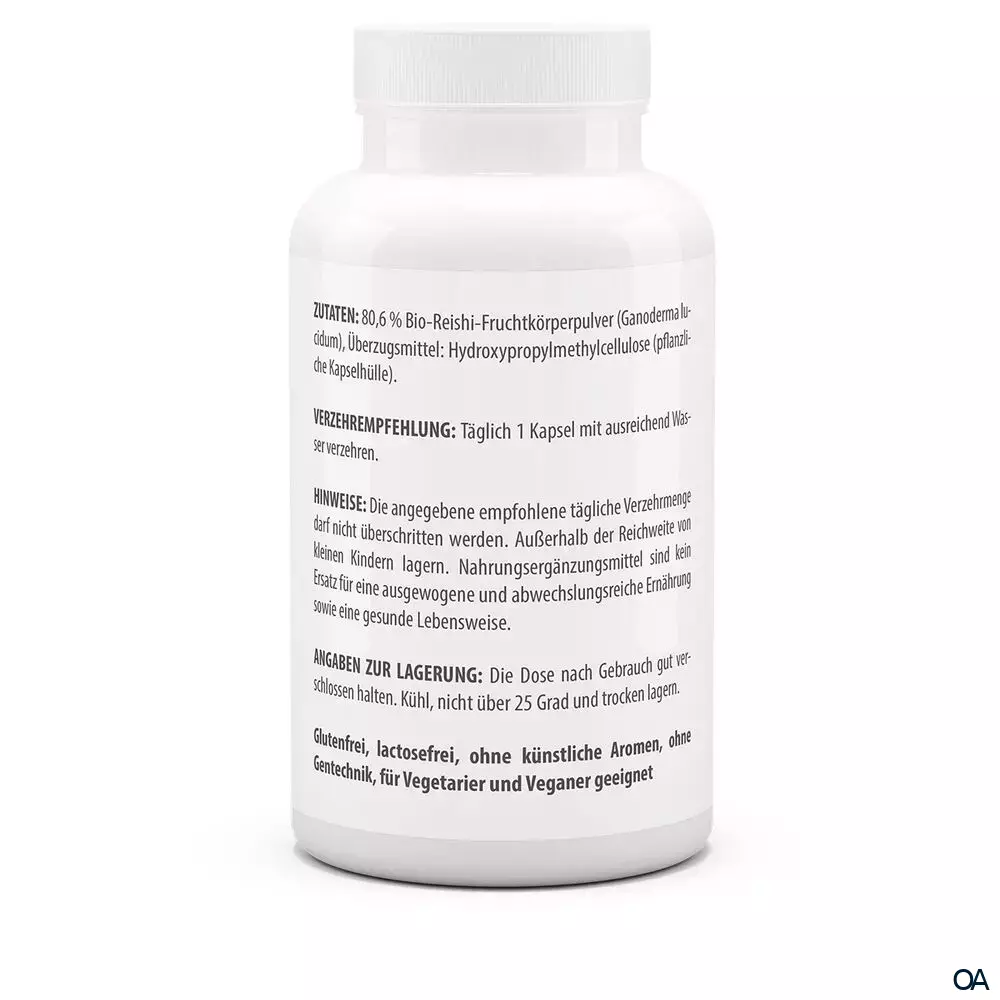 - Zutaten: 80,6 % Bio-Reishi-Fruchtkörperpulver (Ganoderma lucidum), Überzugsmittel: Hydroxypropylmethylcellulose (pflanzliche Kapselhülle).
