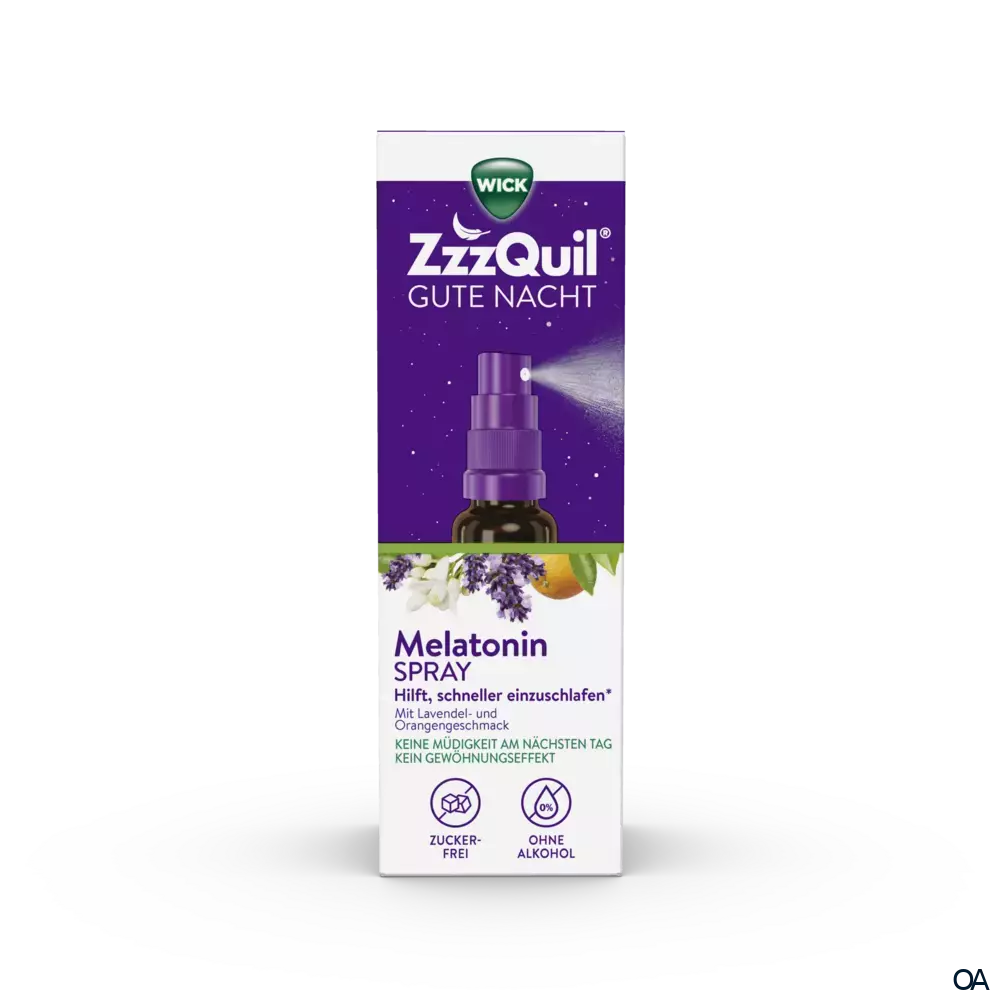 Probieren Sie in diesen Situation das WICK ZzzQuil® Gute Nacht Spray mit Melatonin aus. Das Spray ist einfach anzuwenden. Es wird direkt in den Mund gesprüht, schnell aufgenommen** und hilft Ihnen, schneller einzuschlafen*. Das Spray-Format ermöglicht Ihnen eine flexible Dosierung: Sprühen Sie einfach 4 bis 6 Sprühstöße (1 mg bis 1,5 mg Melatonin) 30 Minuten vor dem Zubettgehen direkt in den Mund. Das WICK ZzzQuil® Gute Nacht Spray schmeckt nach Lavendel und Orange, es wurde ohne Zucker und ohne Alkohol hergestellt und ist es für Vegetarier und Veganer geeignet. Außerdem wurde das WICK ZzzQuil® Gute Nacht Spray ohne künstliche Aromen, Farbstoffe, Gluten und Laktose hergestellt. Da Melatonin, das kurz vor dem Schlafengehen eingenommen wird, während des Schlafs vom Körper abgebaut wird, verursacht das Spray keinen Gewöhnungseffekt und keine Müdigkeit am nächsten Tag. Wenden Sie es einfach bei Bedarf an und beenden Sie die Anwendung, sowie Ihr Schlafrhythmus wieder hergestellt ist.