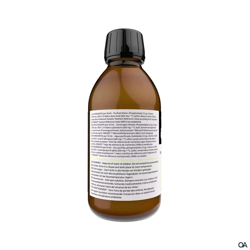 - Zutaten: Gereinigtes Wasser, Phospholipide, Vitamin C, R-Alpha-Liponsäure, Xylit, Konservierungsmittel mit natürlichem Zitronengeschmack: Kaliumsorbat.