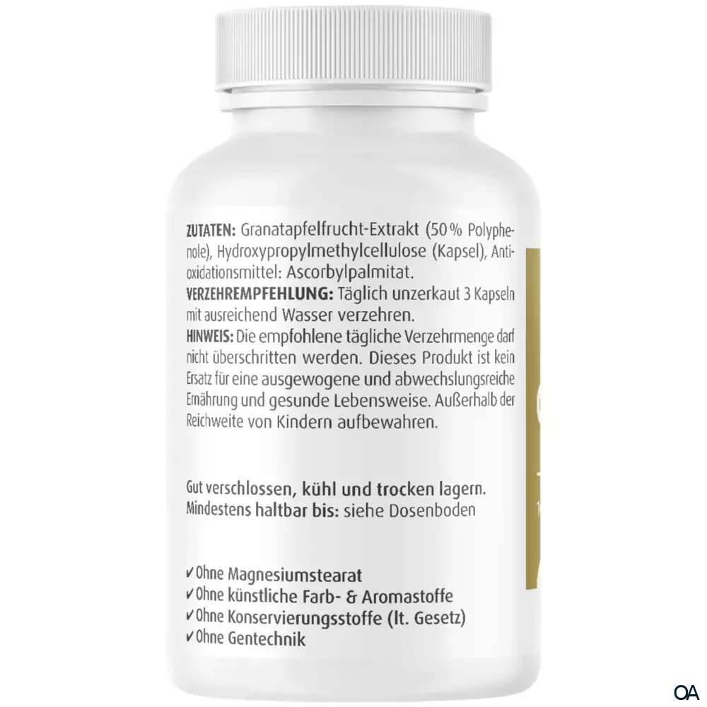 - Nährwertangaben pro 3 Kapseln*: Granatapfelfruchtextrakt 1500 mg - davon Polyphenole 750 mg - davon Ellagsäure 30 mg. * tägliche empfohlene Verzehrmenge.