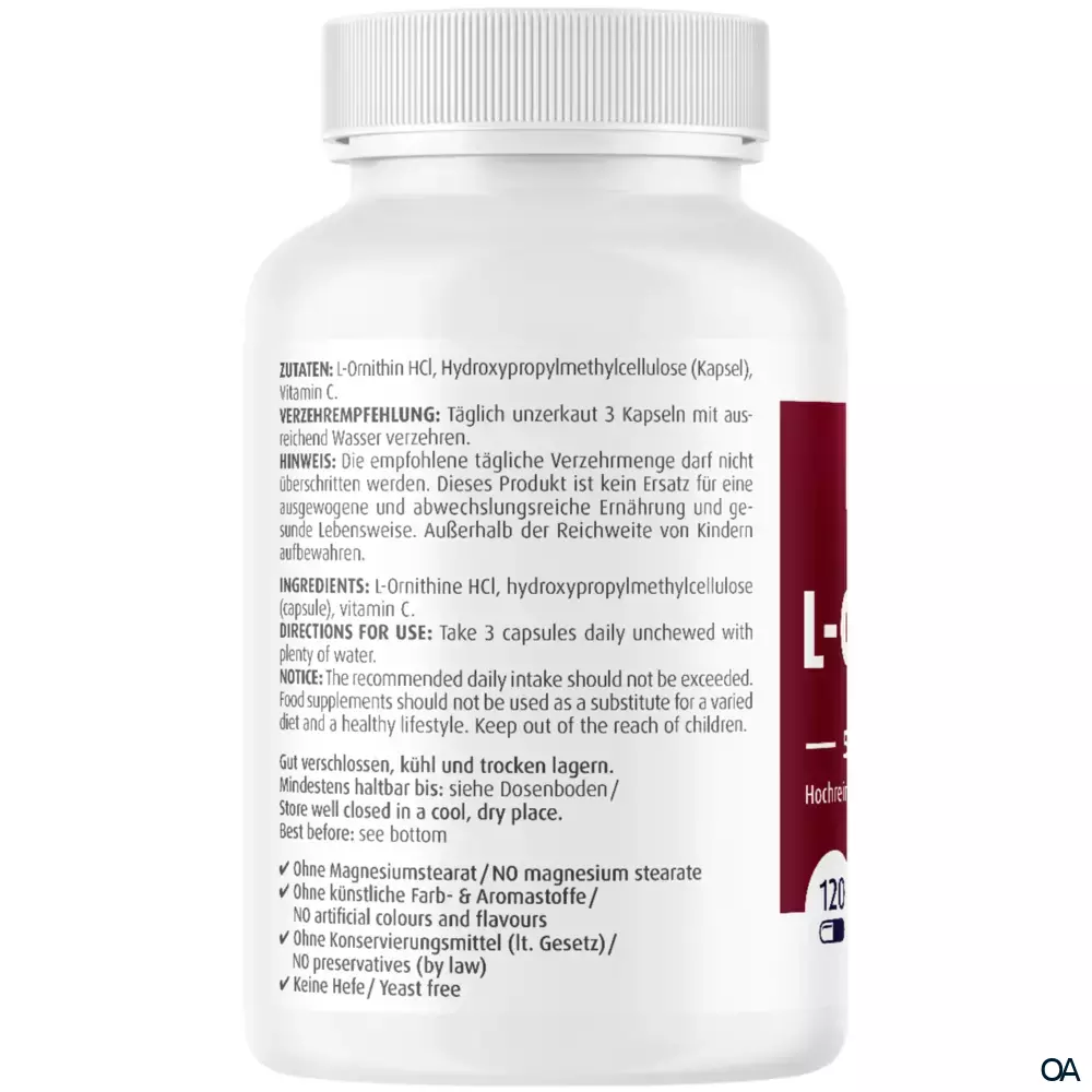 - Zutaten: L-Ornithin HCl (80,6 %; Ornithin), Kapselhülle: Hydroxypropylmethylcellulose (HPMC).