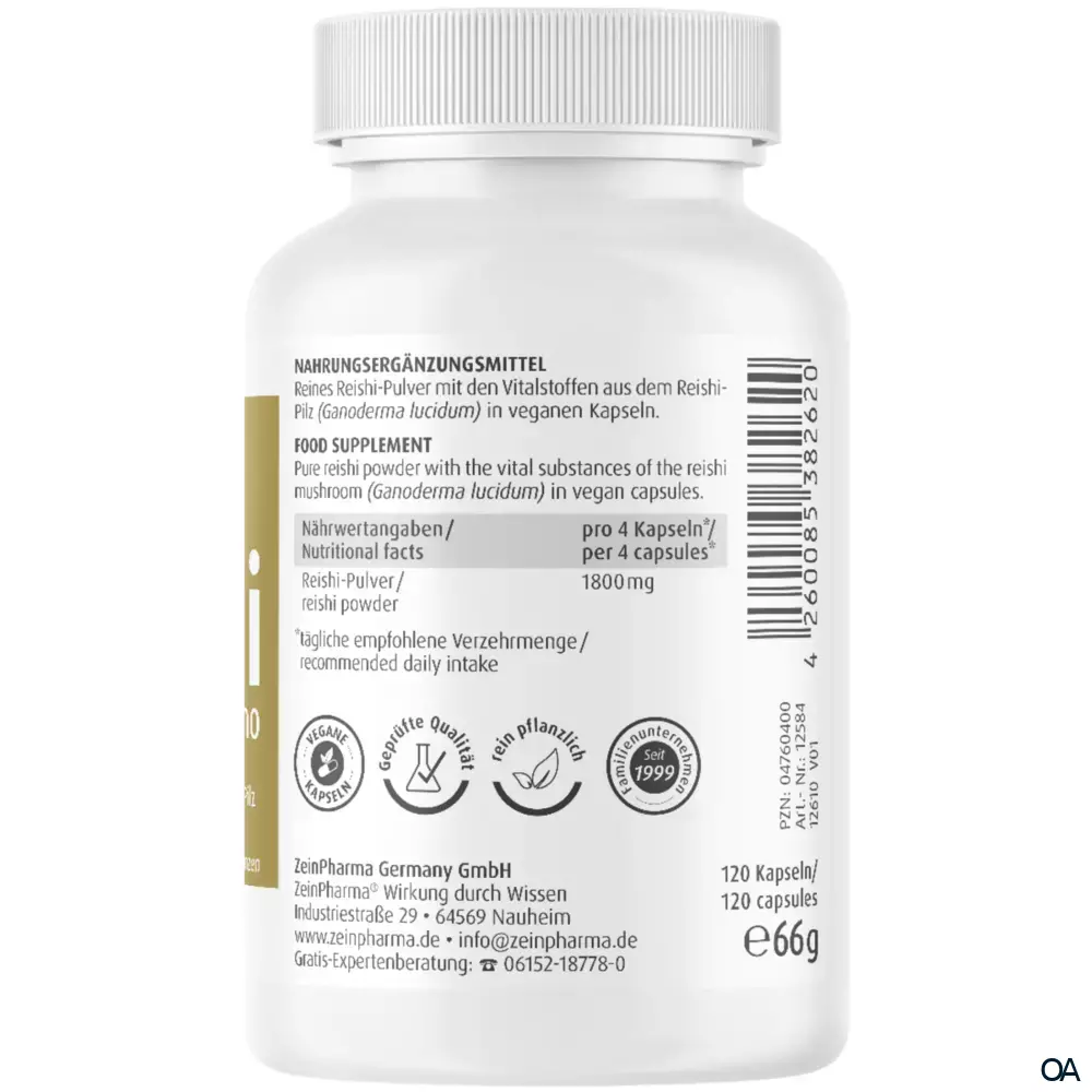 Die ZeinPharma Reishi Mono 450 mg Kapseln sind ein Nahrungsergänzungsmittel mit reinem Reishi-Pulver (Ganoderma lucidum) in veganen Kapseln.Die ZeinPharma Reishi Mono 450 mg Kapseln sind ein Nahrungsergänzungsmittel mit reinem Reishi-Pulver (Ganoderma lucidum) in veganen Kapseln.