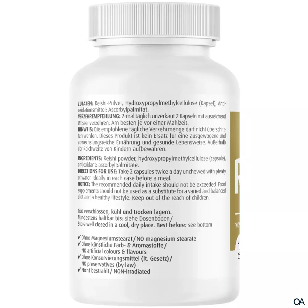 - Zutaten: Reishi Pulver, Hydroxypropylmethylcellulose (Kapsel), Antioxidationsmittel: Ascorbylpalmitat.