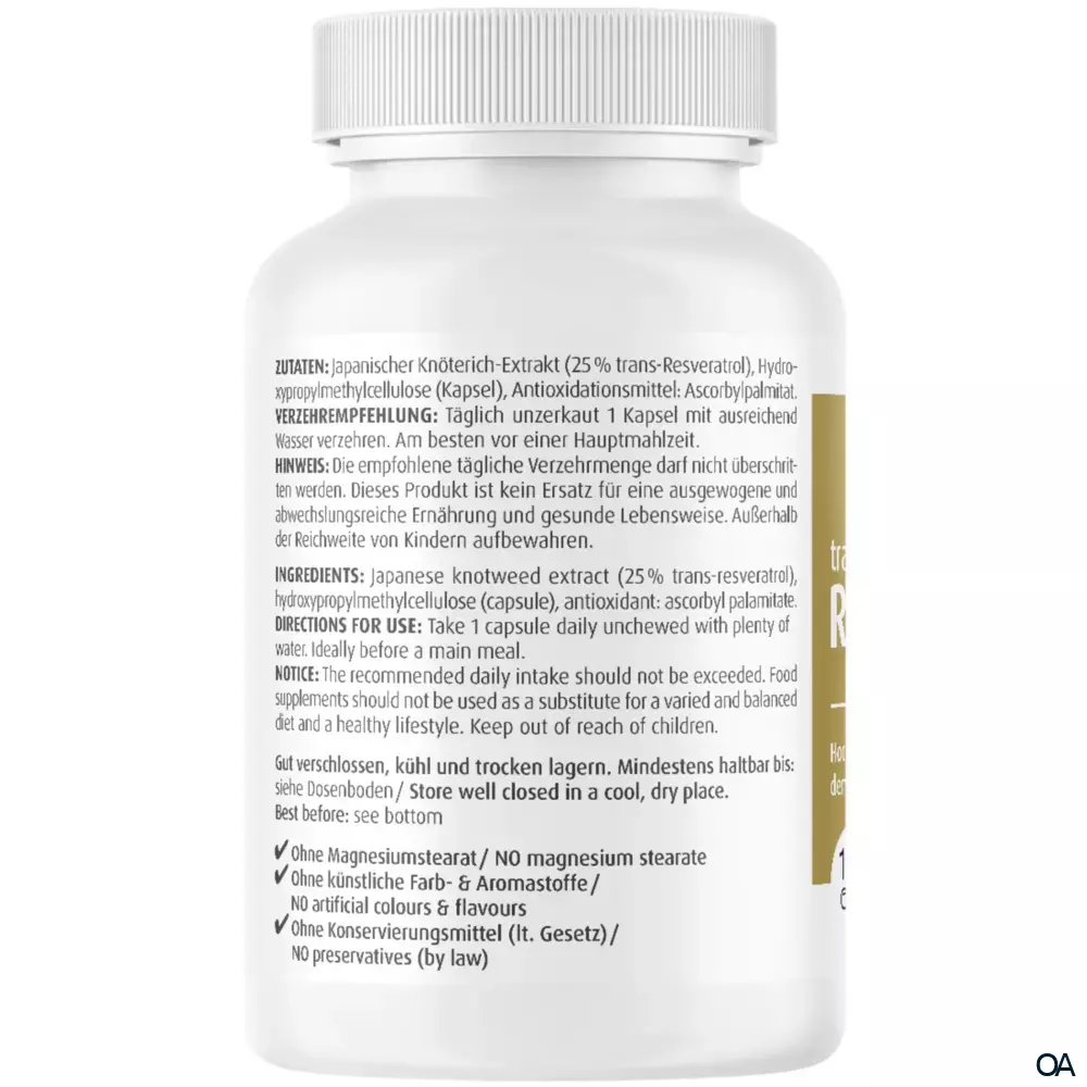 - Zutaten: Japanischer Knöterich-Extrakt (25 % trans-Resveratrol), Hydroxypropylmethylcellulose (Kapsel), Antioxidationsmittel: Ascorbylpalmitat.