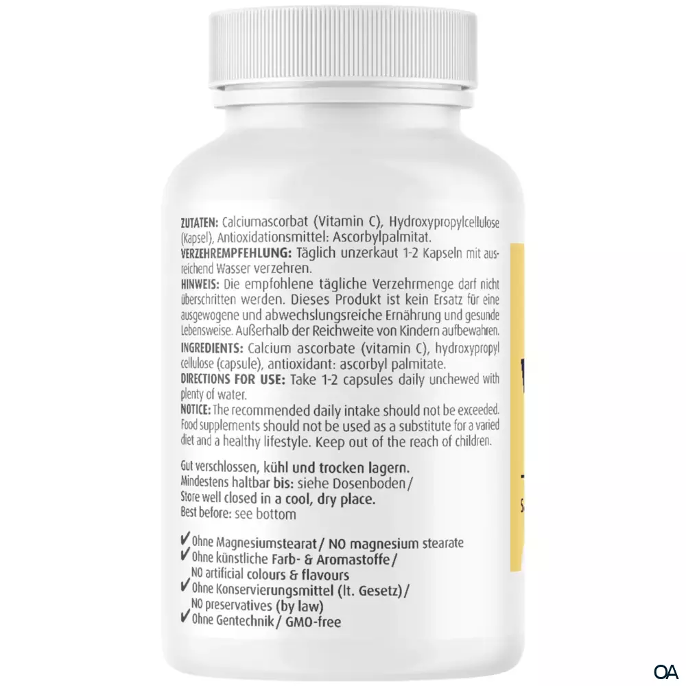 - Zutaten: Calciumascorbat (Vitamin C), Hydroxypropylmethylcellulose (Kapsel), Antioxidationsmittel: Ascorbylpalmitat.